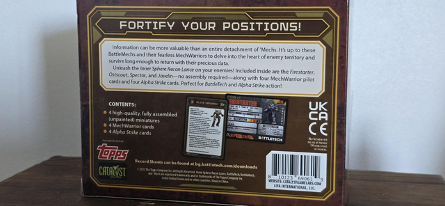 Unleash the Inner Sphere Recon Lance on your enemies! Included inside are the Firestarter, Ostscout, Spector, and Javelin -no assembly required- along with four MechWarrior pilot cards and four Alpha Strike cards.