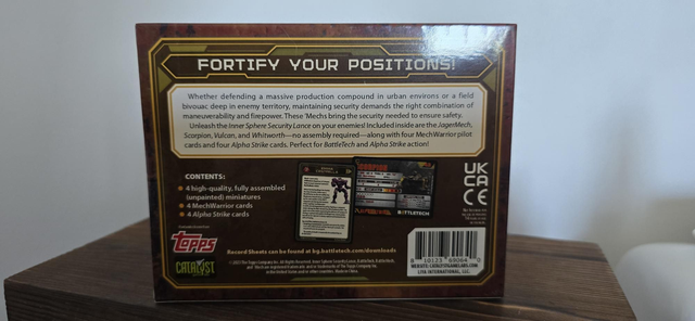 Included inside are the JagerMech, Scorpion, Vulcan, and Whitworth -no assembly required- along with four Mech Warrior pilotcards and four Alpha Strike cards.